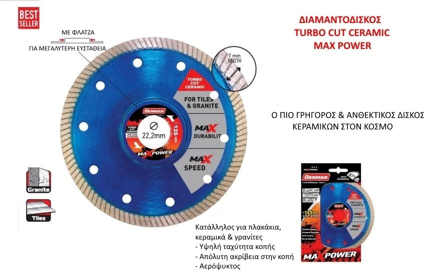 Διαμαντόδισκος Benman 74494 MaxPower Ø125mm για κοπή πλακιδίων, κεραμικών και γρανίτη. Αερόψυκτος, για χρήση σε στεγνή ή υγρή επιφάνεια. Υψηλή ταχύτητα και απόλυτη ακρίβεια στην κοπή.